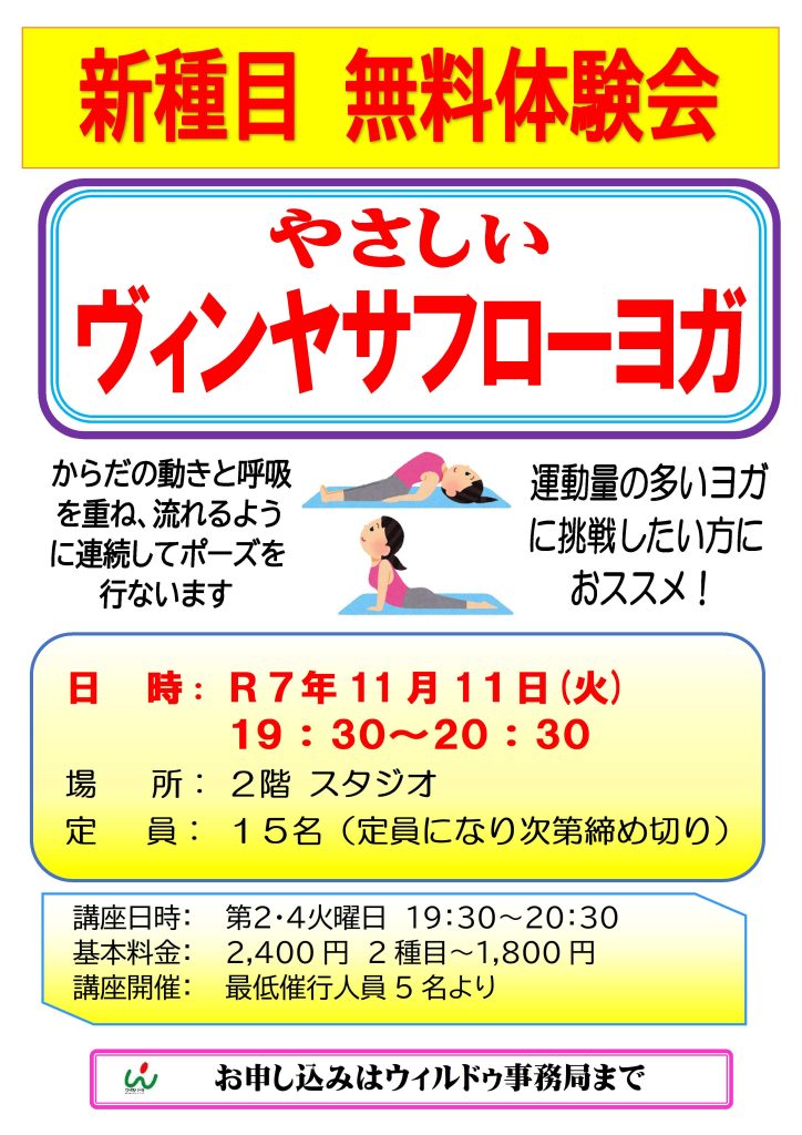 やさしいヴィンヤサフローヨガ 無料体験会 令和7年11月11日(火)19:30~20:30